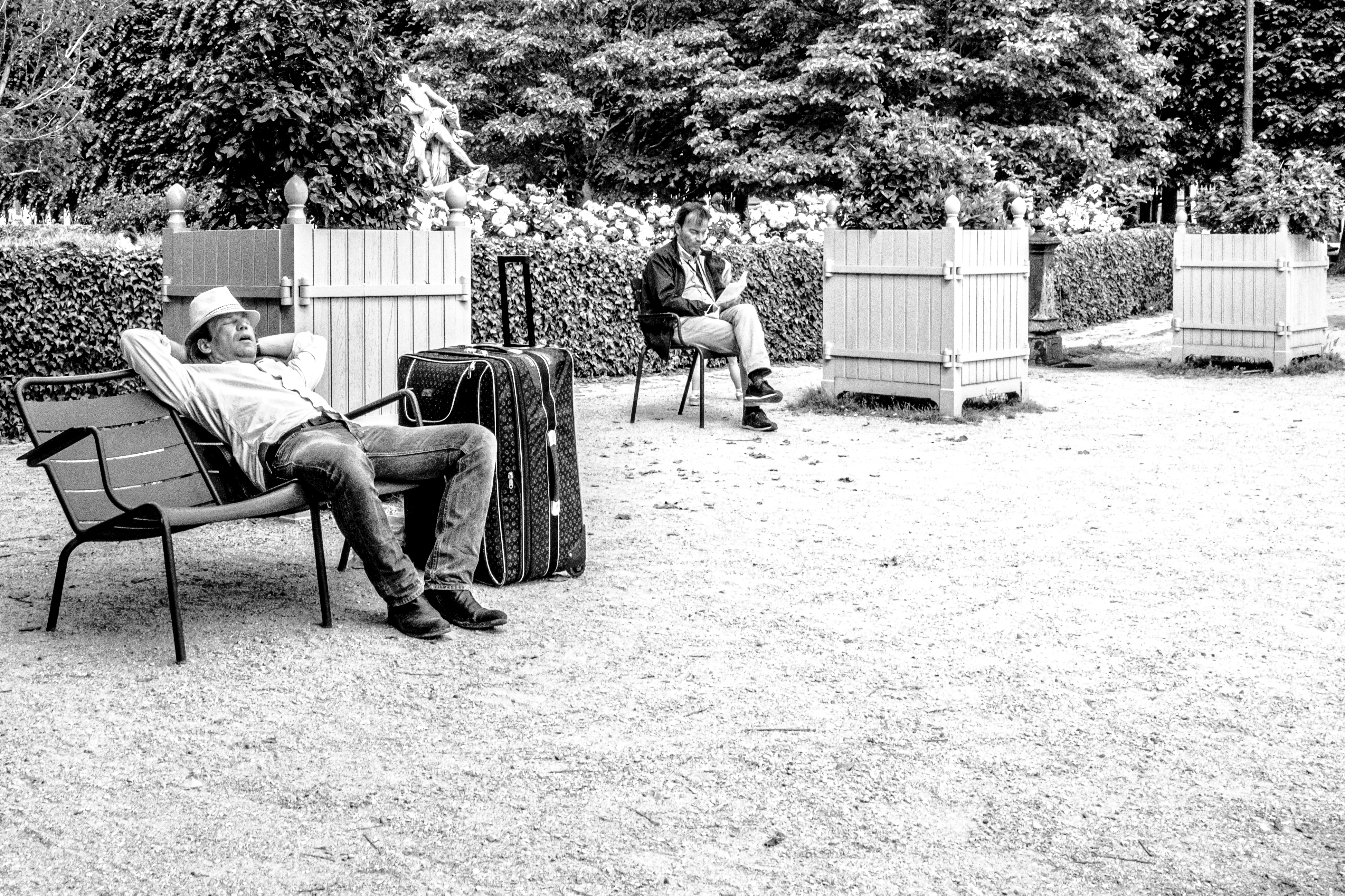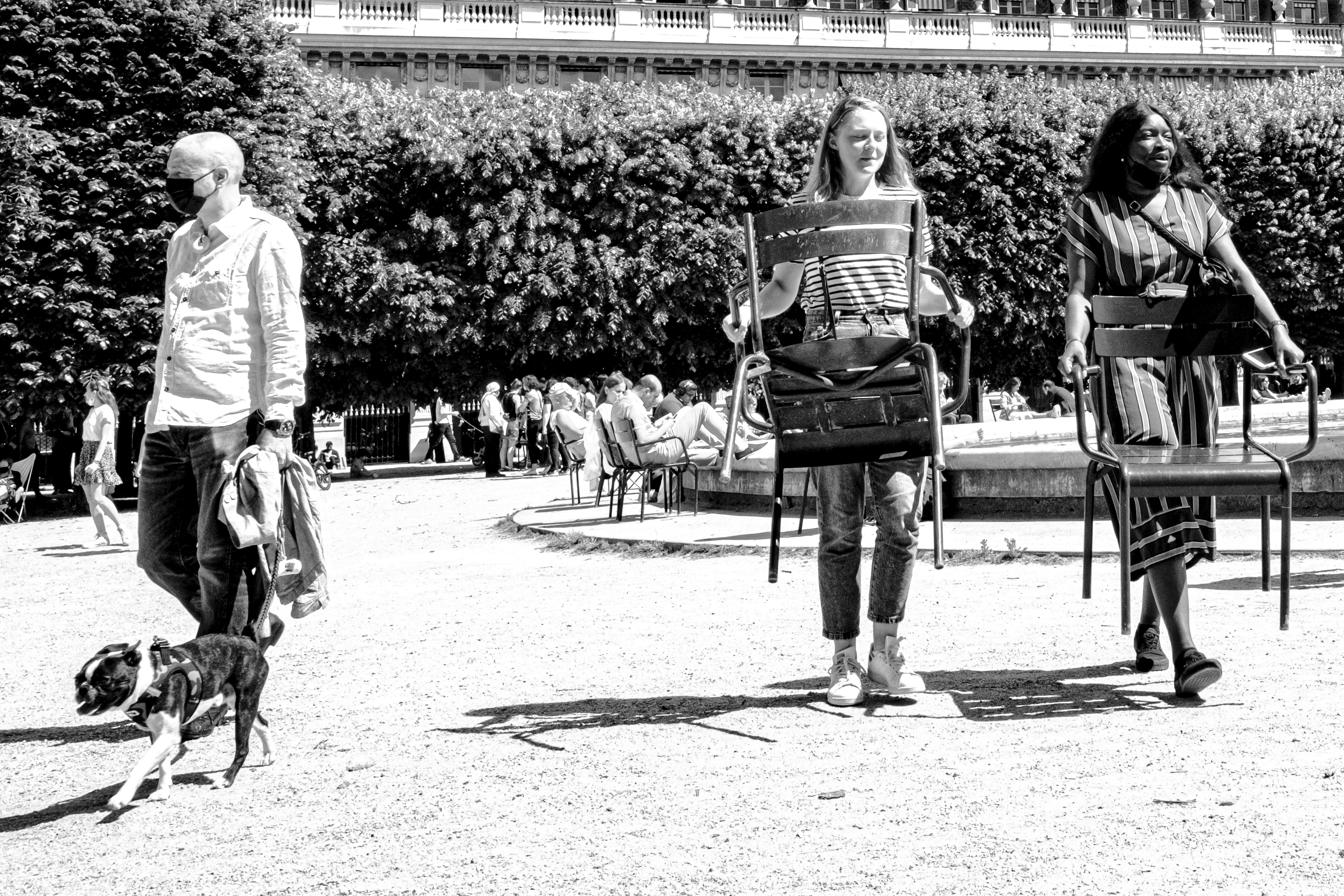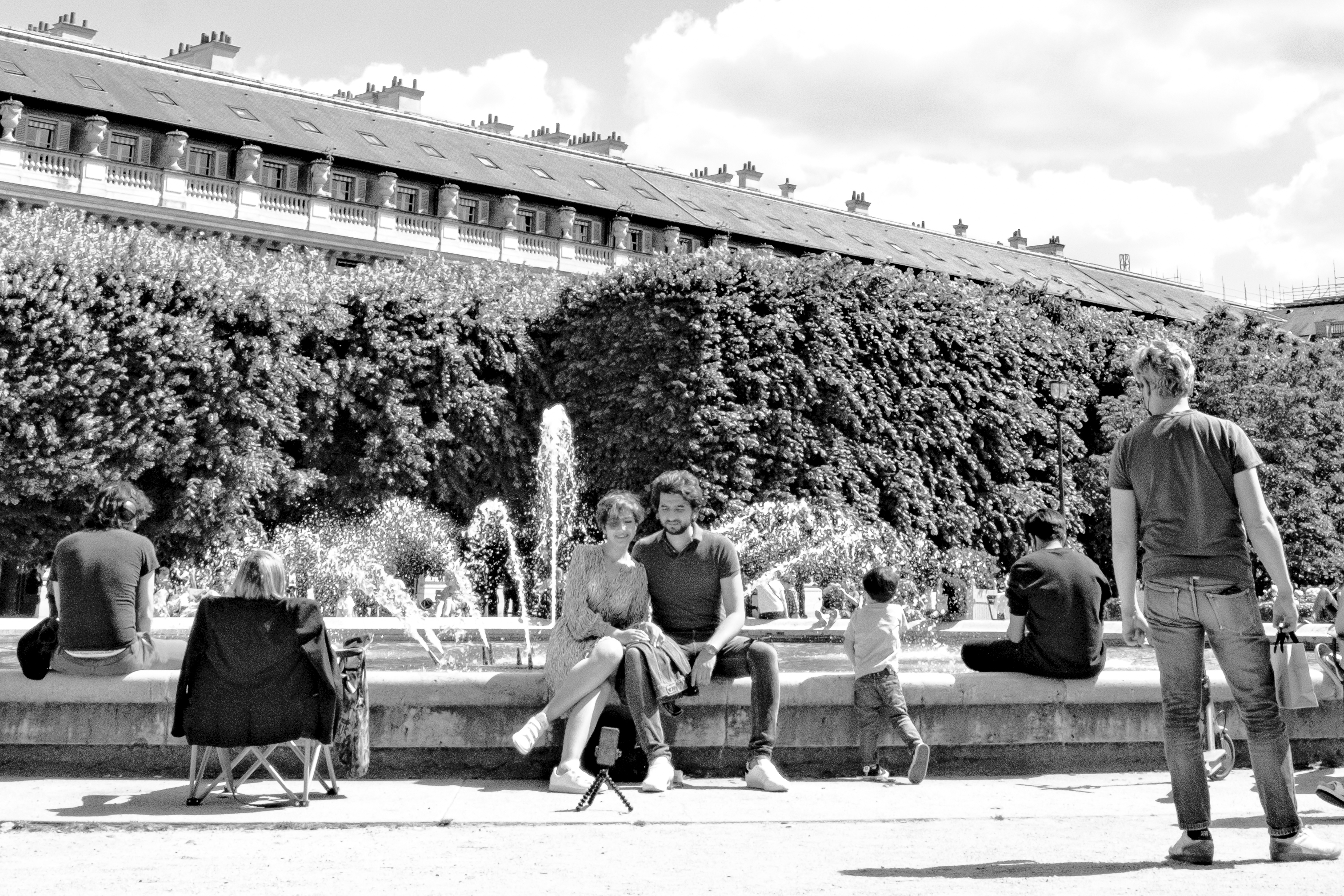 Après-midi au Palais-Royal. J’essaye de maîtriser les multiples fonctions du Fuji XT-4. Quelle bête compliquée. J’ai passé une grande partie de la nuit à suivre en vidéo la masterclass de Damien Bernal. Ce gars là connaît ses appareils, explique assez clairement et sans morgue ni emphase la complexité des menus. Les affinements en instantané me paraissent utopiques et il me faudra trouver mes propres réglages de routine. Je fais quelques essais sur le public assis autour du bassin. L’objectif 18 mm sans possibilité de zoom est une contrainte nouvelle pour moi. Beaucoup de bruit dans les images, tant il y a de passants et de passantes sans intérêt. Cela aurait été plus aisé dans les rues durant le confinement.