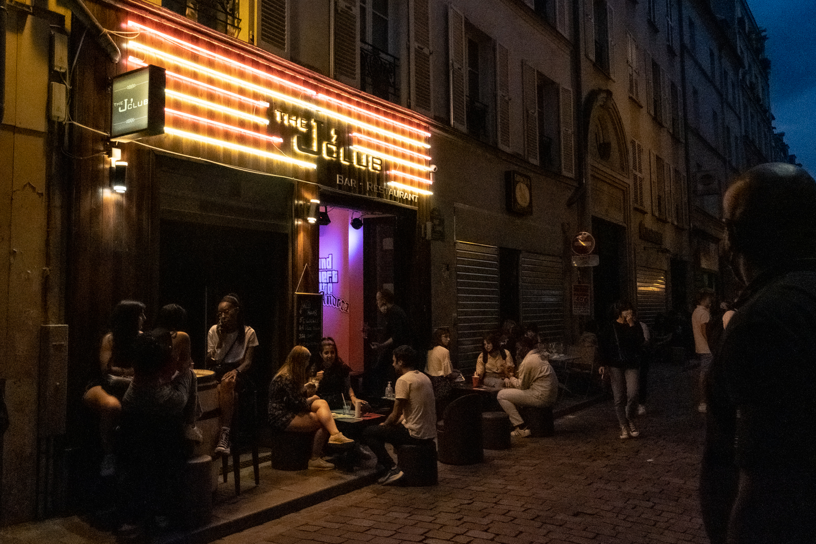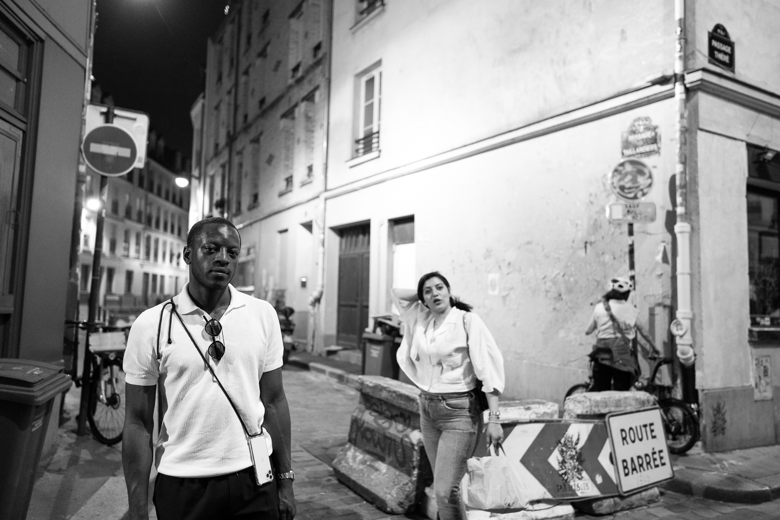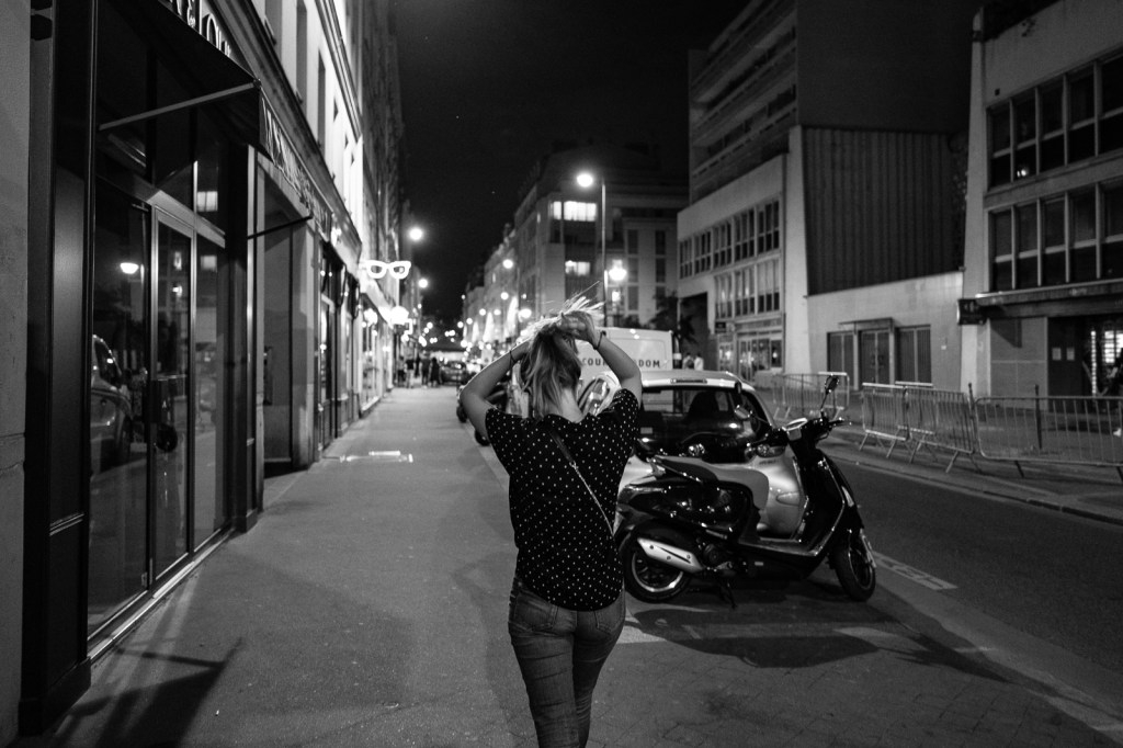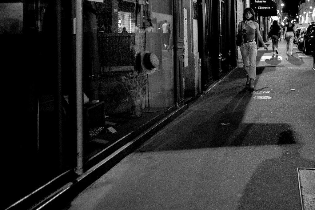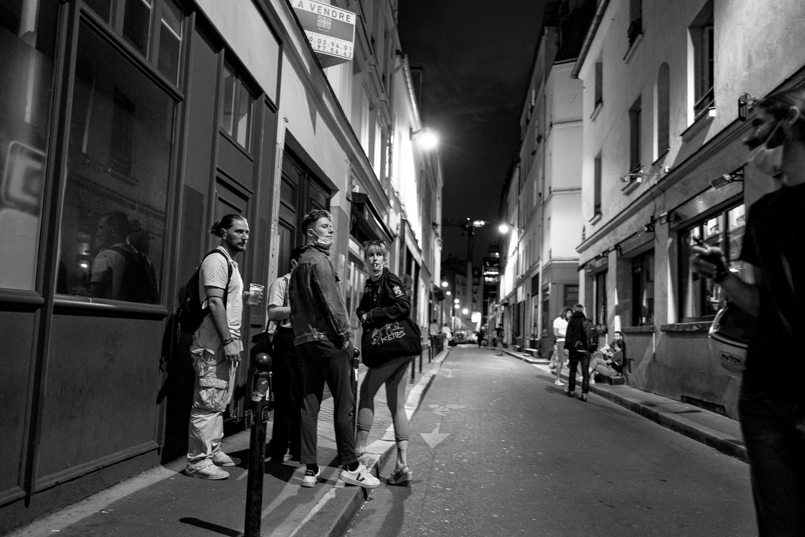 Je suis donc sorti vers 21 heures, en direction d’un des lieux mythiques de la vie nocturne parisienne, la rue de Lappe, à deux pas de la Place de la Bastille. Robert Doisneau y a pris quelques clichés fameux (dans Bystanders, ouvrage américain de référence sur l’histoire de la street photography, un de ses portraits d’Arlette est par erreur titré « Rue de Laffe »). Evidemment, je ne me prends pas pour Doisneau, et, de toute manière, on ne danse plus ni musette ni tango rue de Lappe, pas plus qu’on n’y joue de l’accordéon. Les jeunes y viennent pour se retrouver, boire, et probablement consommer quelques substances non homologuées. Tout paraît tranquille, plutôt joyeux, un passage de brigade de police, peu avant 23 heures semble de pure routine. N’ayant ni grande connaissance des lieux ni maîtrise de mon nouvel appareil, ma promenade était purement expérimentale.