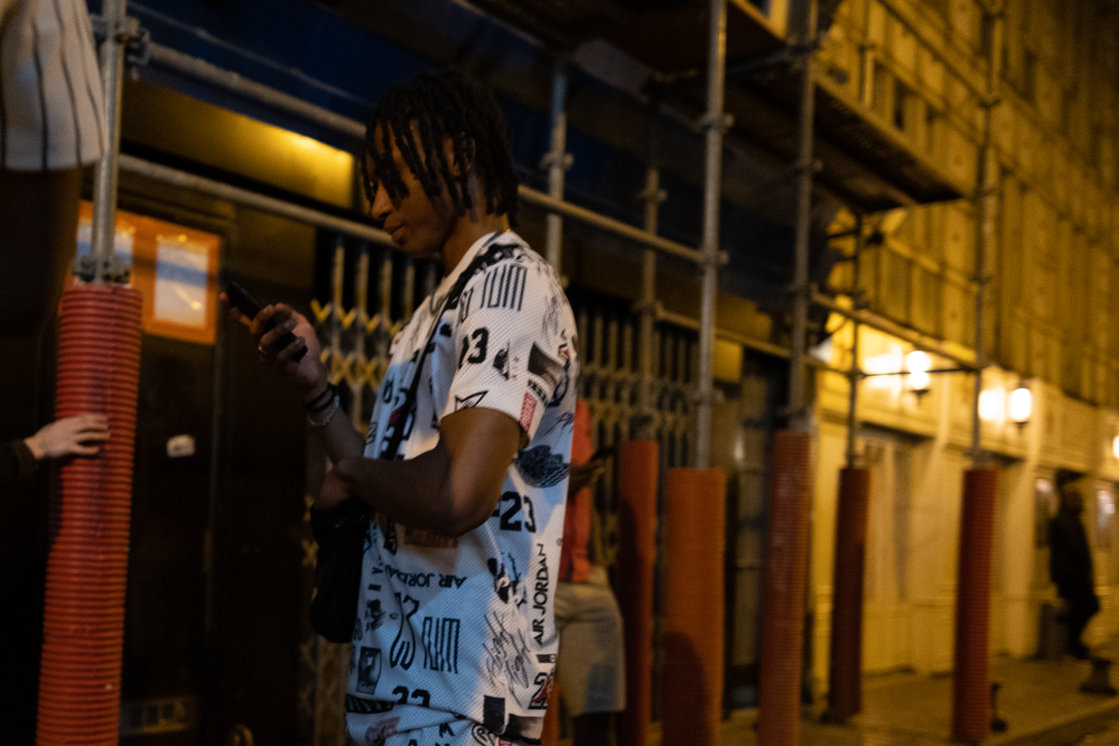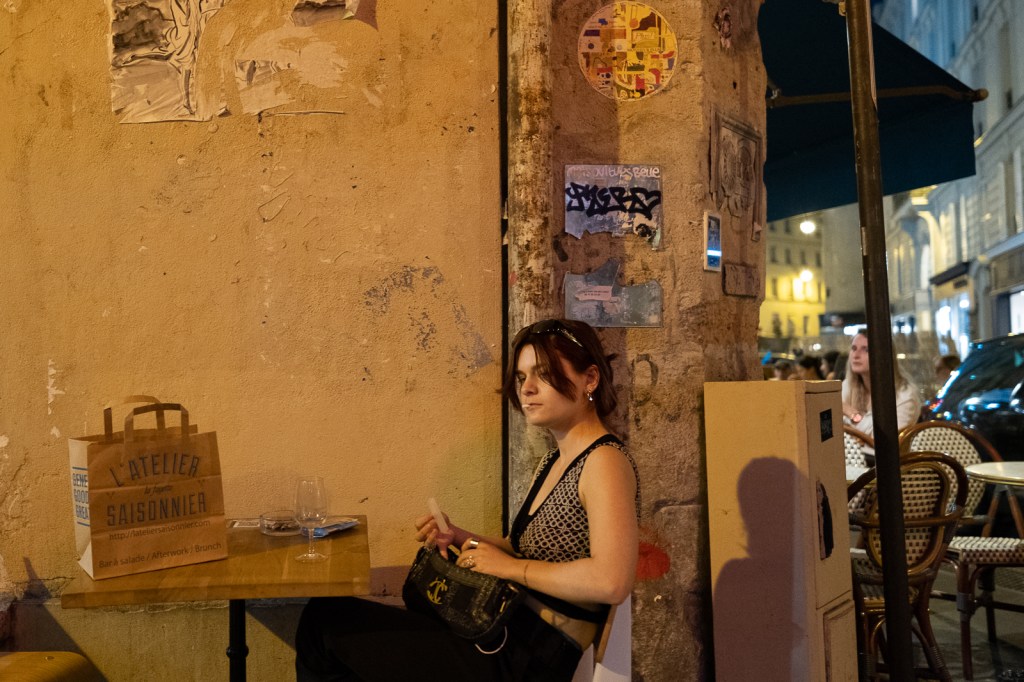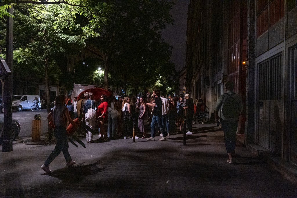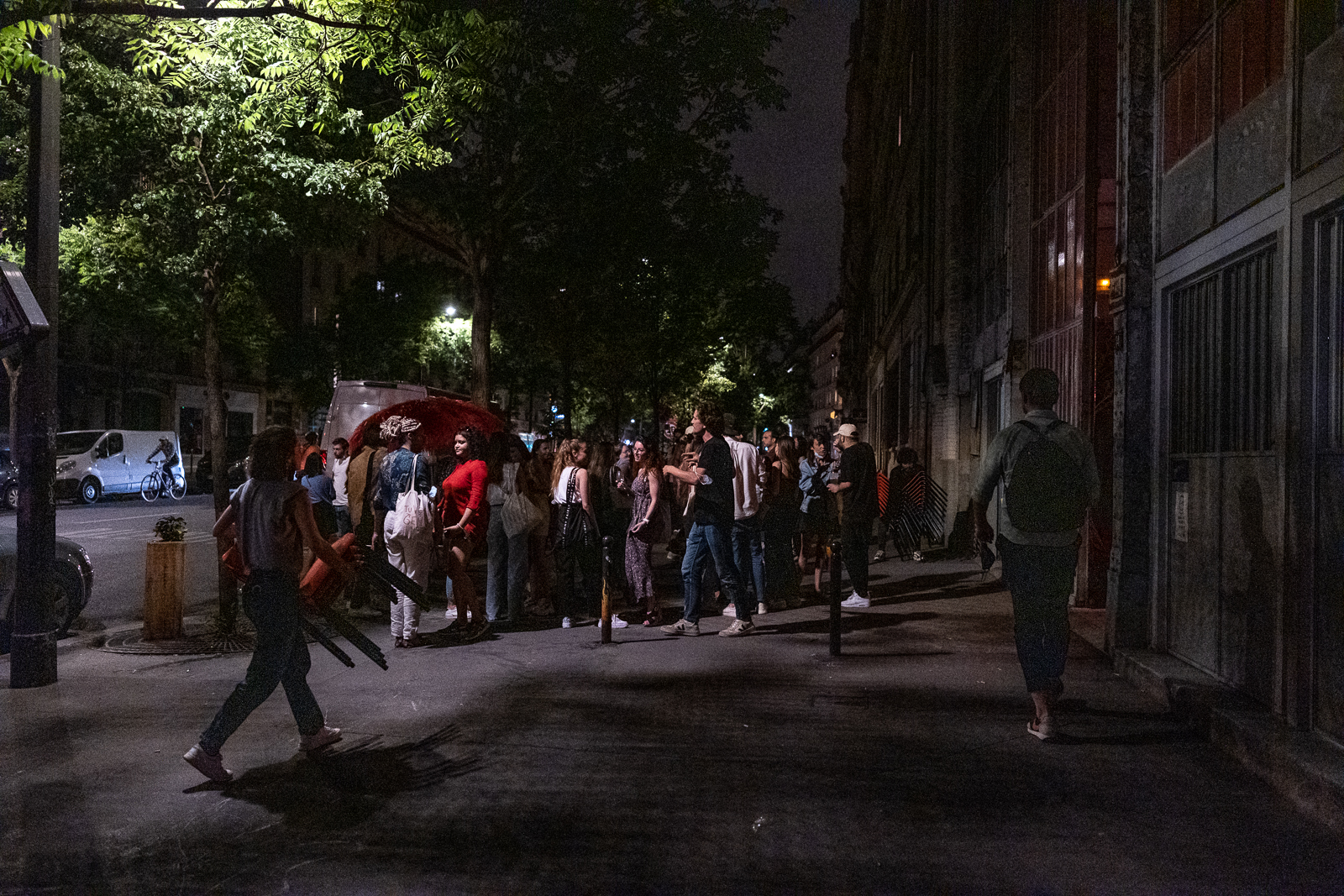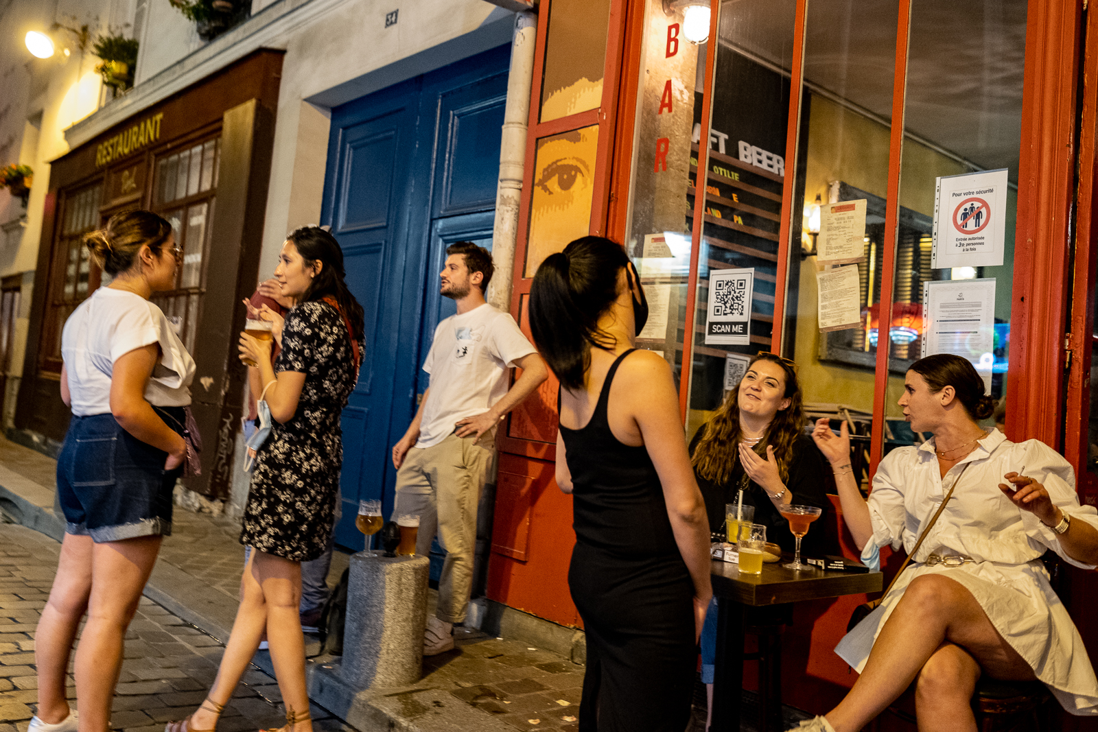 Je suis donc sorti vers 21 heures, en direction d’un des lieux mythiques de la vie nocturne parisienne, la rue de Lappe, à deux pas de la Place de la Bastille. Robert Doisneau y a pris quelques clichés fameux (dans Bystanders, ouvrage américain de référence sur l’histoire de la street photography, un de ses portraits d’Arlette est par erreur titré « Rue de Laffe »). Evidemment, je ne me prends pas pour Doisneau, et, de toute manière, on ne danse plus ni musette ni tango rue de Lappe, pas plus qu’on n’y joue de l’accordéon. Les jeunes y viennent pour se retrouver, boire, et probablement consommer quelques substances non homologuées. Tout paraît tranquille, plutôt joyeux, un passage de brigade de police, peu avant 23 heures semble de pure routine. N’ayant ni grande connaissance des lieux ni maîtrise de mon nouvel appareil, ma promenade était purement expérimentale.