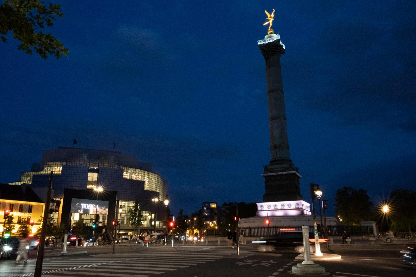 Ce n’est qu’arrivé Place de la Bastille, peu avant le couvre-feu, que j’ai testé l’appareil avec un temps de pause plus long, puis avec un choix automatique de la focale. Et là, le résultat se révèle étonnant. Avec la focale 1,4, l’appareil donne des résultats bien plus précis en 3200 ISO, une niveau de photométrie permettant l’agrandissement. J’ai longé une nouvelle fois, en vitesse, la rue de Lappe. A ce stade, bien entendu, rien de très original dans les sujets. Il ne restait plus en rue que quelques groupes un peu tardifs.