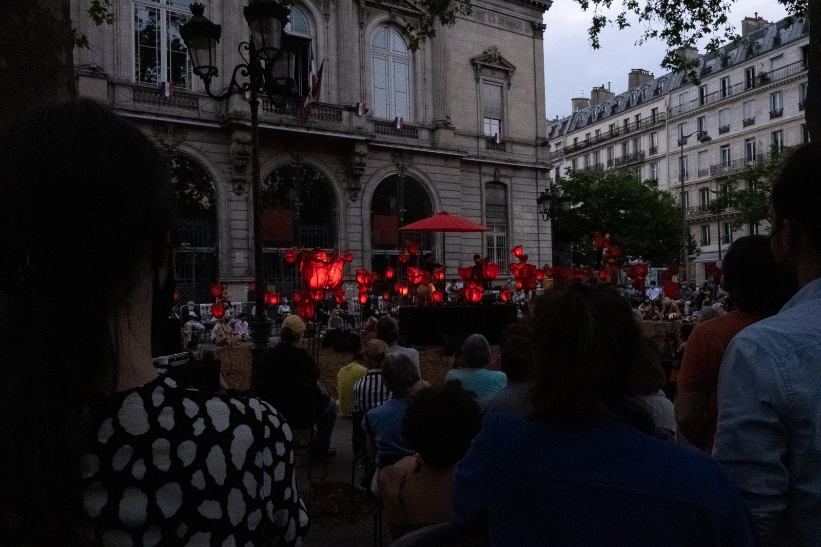 Sans entrer dans les détails techniques, je mentionnerais simplement que le Fujinon XF18mmF1.4 R LM WR repose sur une formule optique de 15 lentilles réparties en 9 groupes. Le diaphragme comporte 9 lamelles circulaires et la distance de mise au point minimale est de 20 cm. A la différence du 18-55 classique fourni dans le kit, un objectif grand angle ne permet pas de zoomer de manière significative. Les seules variables possibles sont sur les focales, de 1,4 à 16, et, bien sûr, le temps de pause, la photométrie et tous les réglages offerts par l’appareil. Pour les photos prises en journée, je commence à obtenir des résultats très satisfaisants. Pour ma première sortie nocturne, je l’ai bloqué sur un temps de pause de 1/125, qui est le minimum pour fixer les mouvements humains et j’ai d’abord testé les focales hautes (16 et 11). Les résultats n’ont été que moyennement probants, permettant d’obtenir des clichés assez banals des ensembles attablés, entre chien et loup, en terrasses Rue Saint-Maur, Avenue Parmentier ou Rue de la Roquette ou encore de le public du concert de rue rencontré sous la statue de Léon Blum, au pied de la Mairie du 11ème arrondissement, une initiative de l’association Onze bouge.