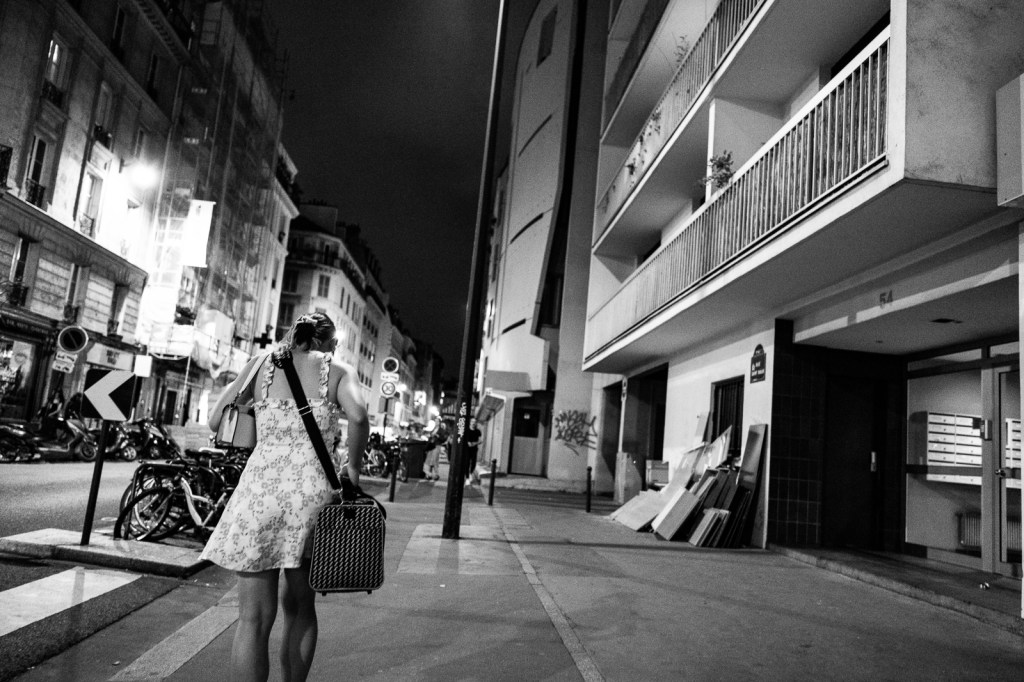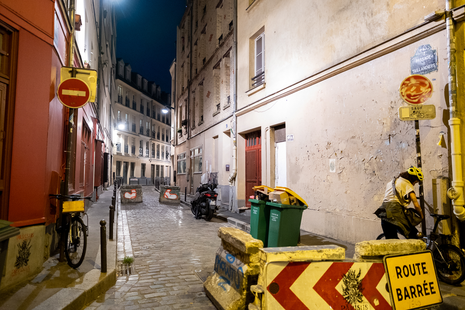 L’objectif révèle alors que, même dans la nuit, il peut fournir un époustouflant degré de netteté, y compris dans le lointain. Je suis en particulier content du cliché du Passage des Taillandiers, avec cette cycliste en train de décrocher le cadenas de son vélo. La perspective brisée de ce passage m’avait déjà intéressé lorsque je l’avais découverte il y a quelques semaines, en plein jour.