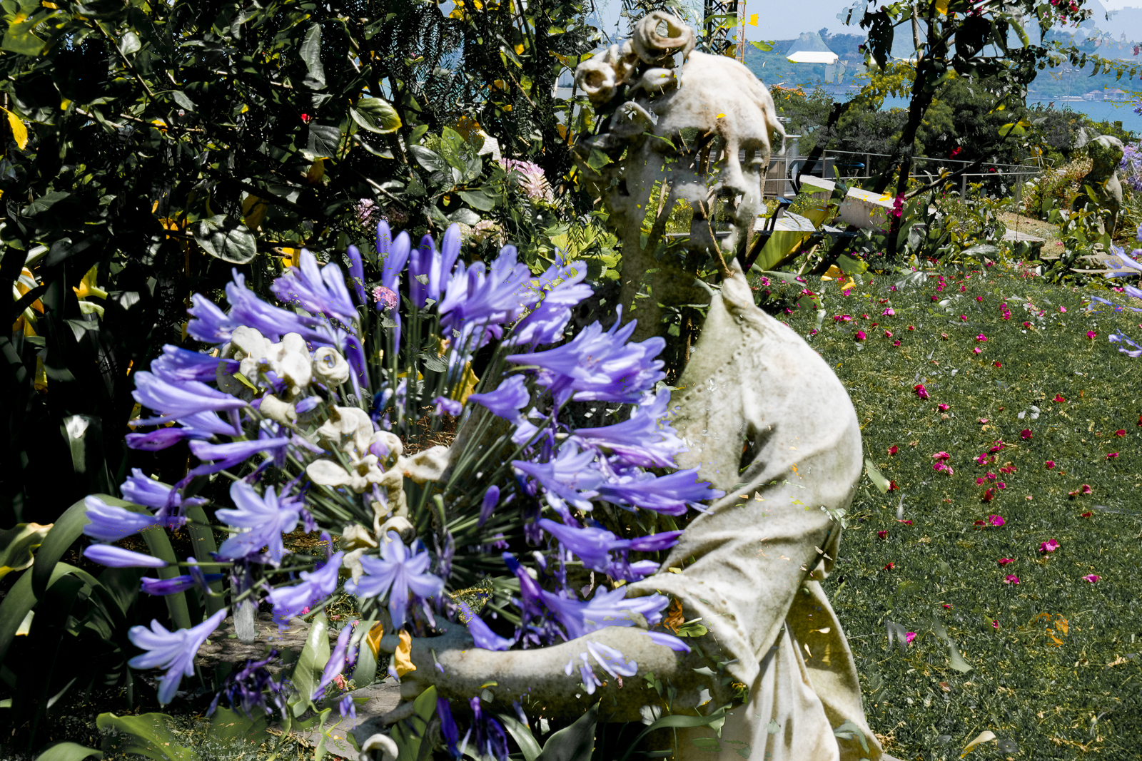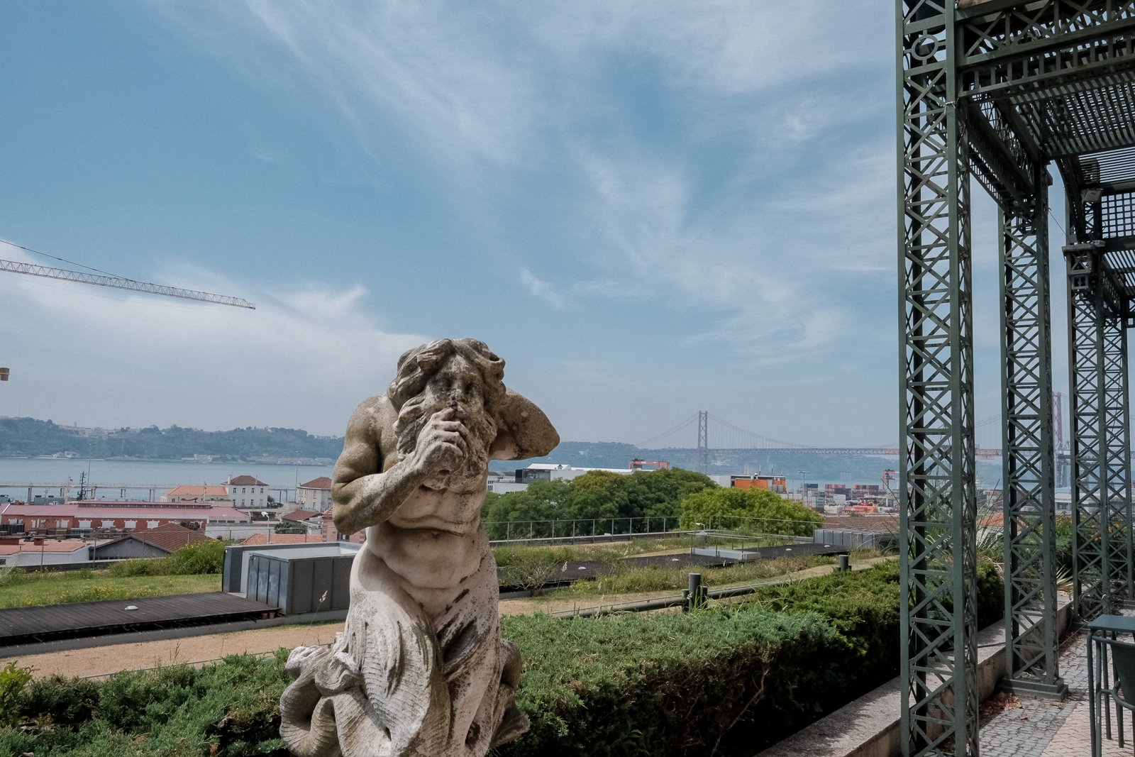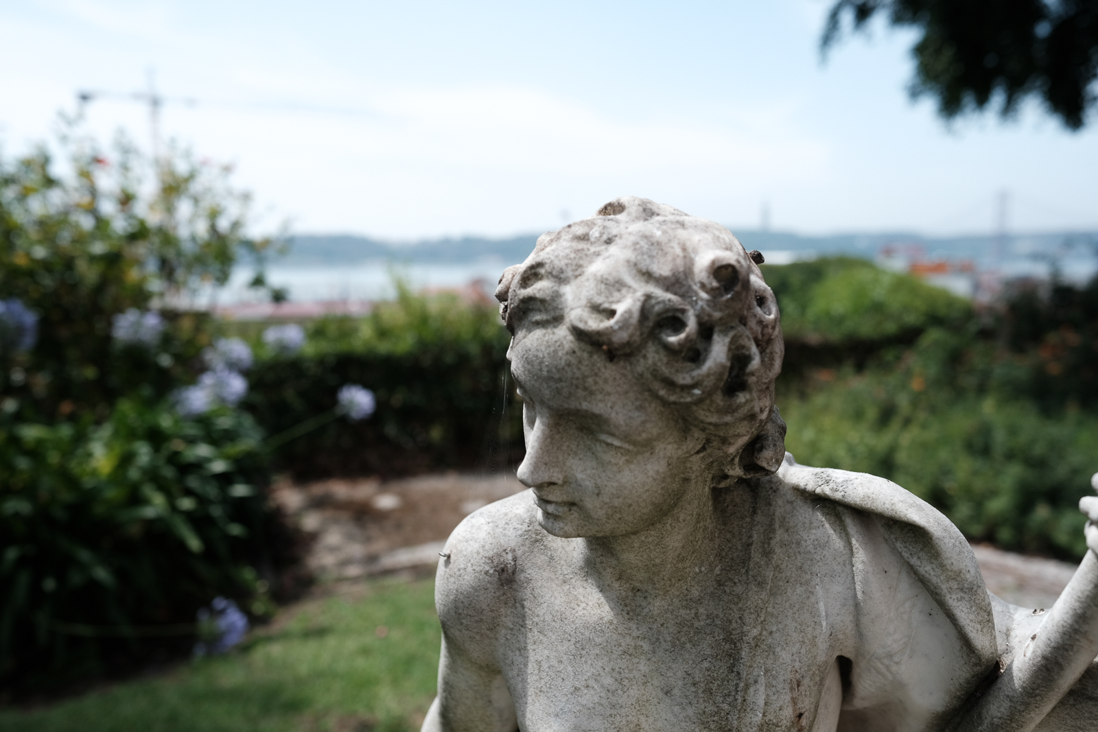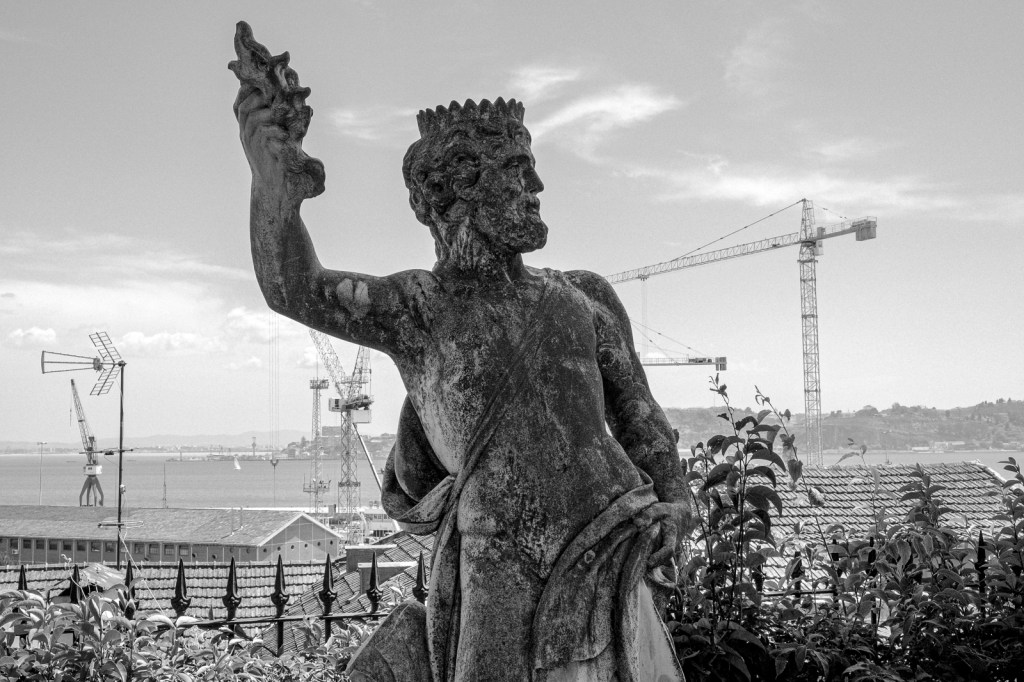 Pour passer le temps, je photographie les statues qui agrémentent le jardin. Ce ne sont pas de grandes oeuvres. Des copies, probablement du XVIIIe siècle, de sujets mythologiques. Mais cela doit être la troisième ou quatrième fois que je les fixe. J’aime bien retrouver Zeus sur un fond de grues portuaires, Bacchus face au pont du 25 avril. e teste les réglages de profondeur de champ.