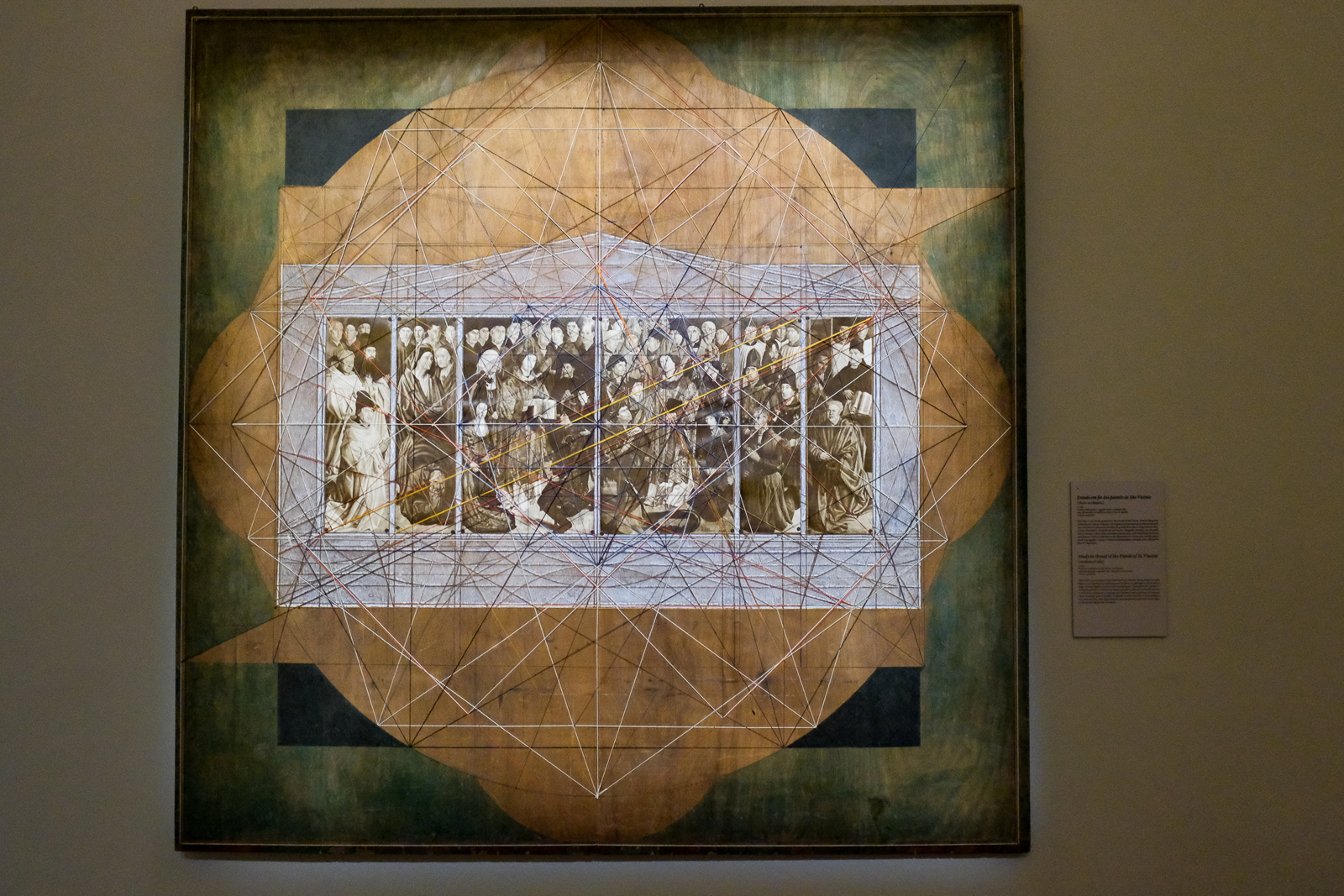 L’étude d’Almada qui nous est présentée ne porte pas sur ces questions historiques, mais sur la géométrie du tableau, dont il a essayé de tracer les lignes de composition avec des fils de couleur. Ce travail, réalisé dans les années 50 était une des oeuvres les moins connues de l’artiste prolifique vient d’être restaurée, alors que le polyptique lui-même n’est plus visible depuis deux ans, étant lui aussi en laboratoire de restauration.