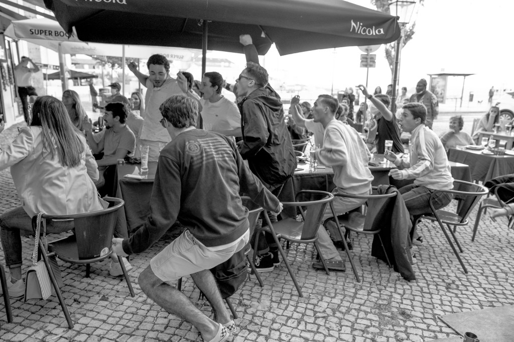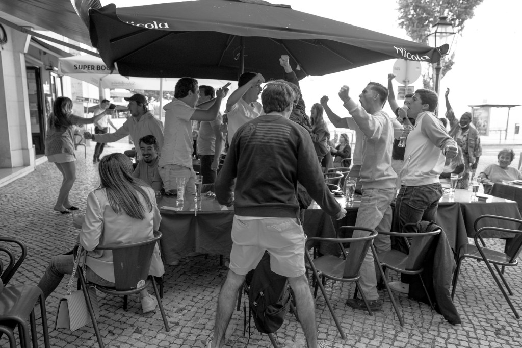 Nous décidons d’aller suivre le match au Cantinho ao Sol, à la même terrasse que celle où nous avions suivi Hongrie-Portugal. Le public est très différent. Plusieurs tables ont été réservées par un groupe de jeunes Portugais. Deux tables sont occupées par des Français. L’Angolais qui égrainait son chapelet pendant le match est là, debout. Il explique aux Français qu’il a longtemps vécu à Marseille, mais ne se prononce pas sur ses préférences.
