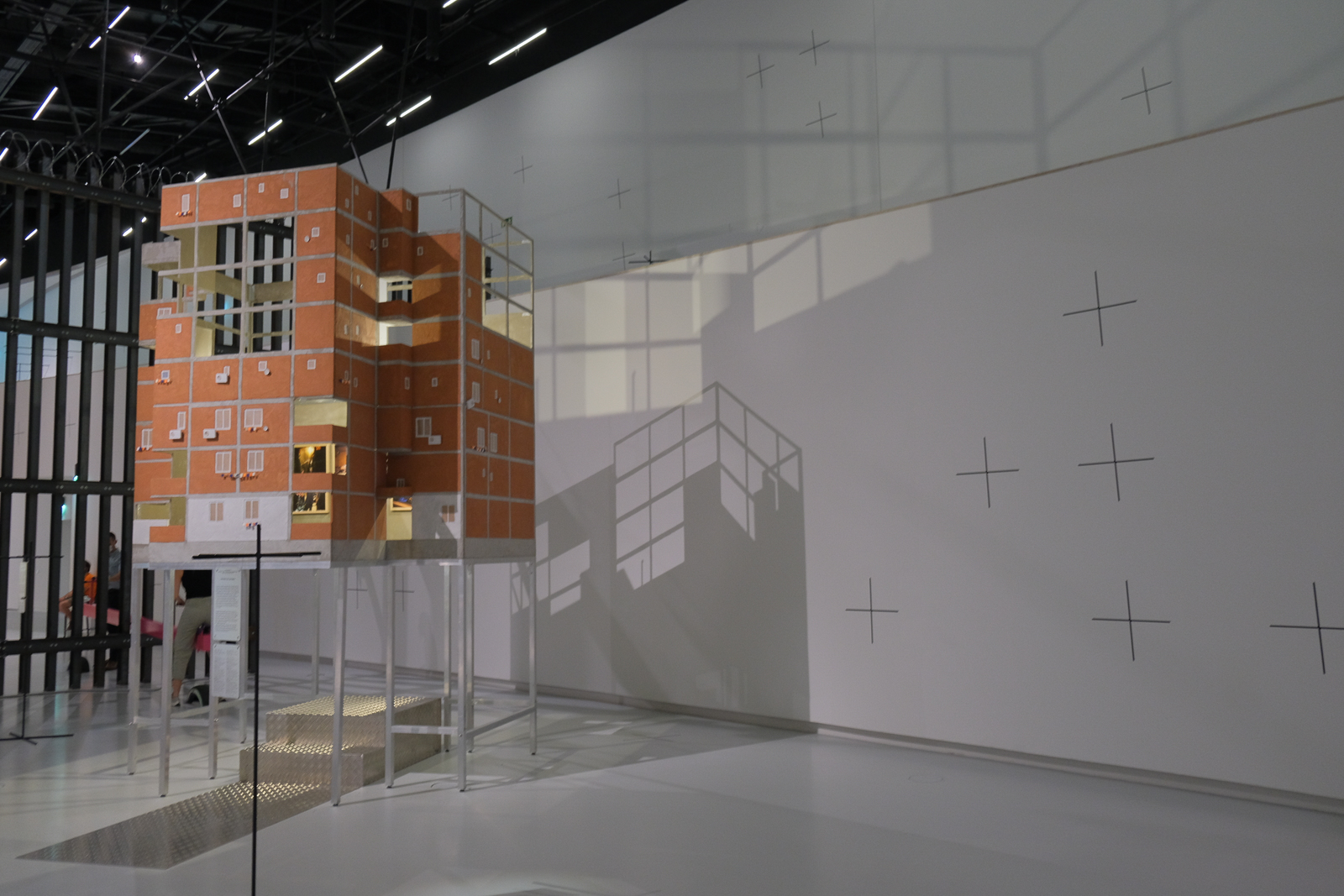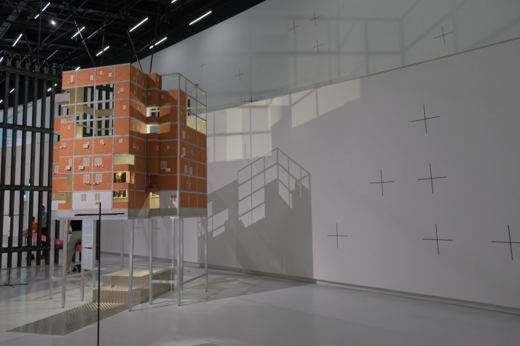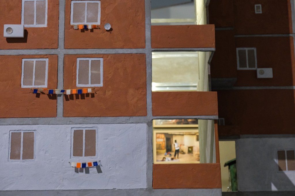 Les oeuvres exposées me laissent sceptiques. Pour les comprendre, il faut lire des textes explicatifs, qui me fatiguent vite. La seule qui m’intéresse un peu est Modelo da Jamaika, qui est la maquette d’un immeuble, à présent détruit du quartier Bairro do Vale de Chicaros, aussi appelé Bairro da Jamaika, dans la banlieue de Lisbonne. Des photographies, que l’on peut voir à l’intérieur de la maquette, évoquent les conflits qui ont opposé les communautés d’immigrants illégaux, venus des anciennes colonies africaines, et les propriétaires des terrains. Le procédé me rappelle un peu les dessins d’Albert Robida, présentant des immeubles en coupe avec les appartements et les habitants, procédé qui fut repris pour une couverture d’édition en poche de La vie mode d’emploi de Perec.