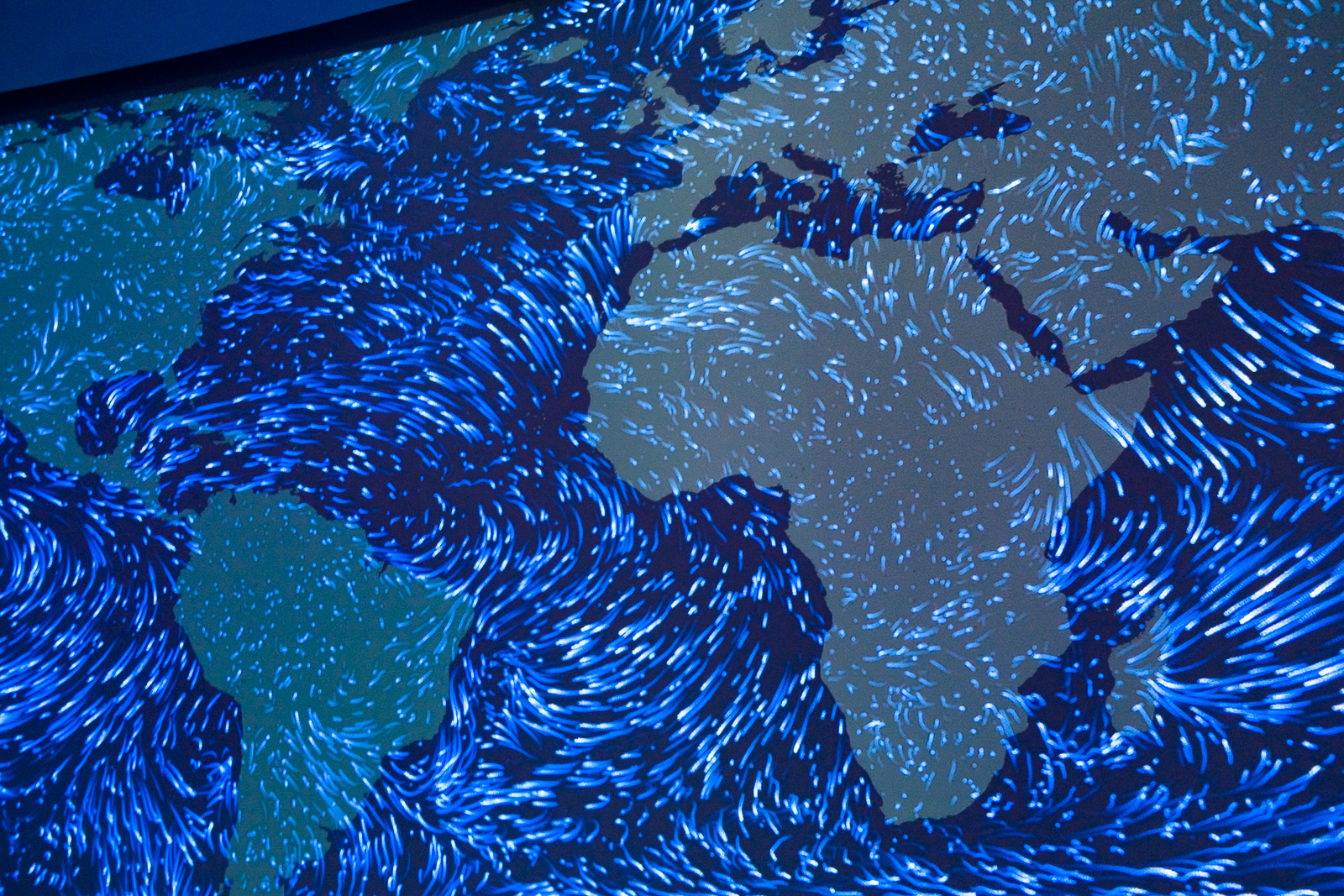 On n’est plus ici dans la démarche artistique aspirant à la sensibilisation politique, mais dans un projet scientifique de sensibilisation qui, par son recours aux technologies de pointe résulte en une esthétisation de la catastrophe annoncée. Je dois admettre que cette démarche m’intéresse plus que la première, même si la politique du climat (dont l’importance à mes yeux ne fait aucun doute) ne me passionne pas. La carte animée des vents, dont je ne puis donner ici qu’une simple image fixe, est de toute beauté. L’audiovisuel climatique est la dégradation de la planète à un degré tel qu’elle est devenue image.