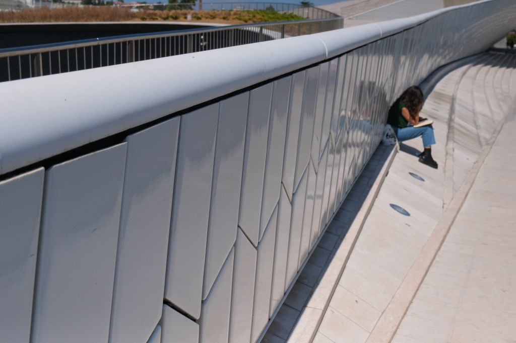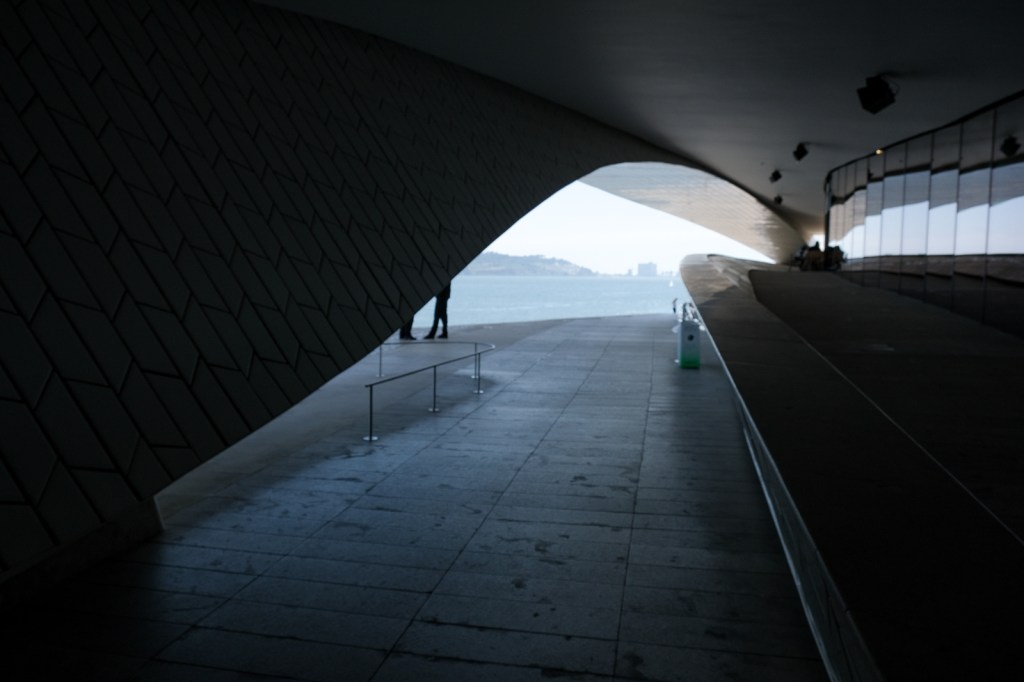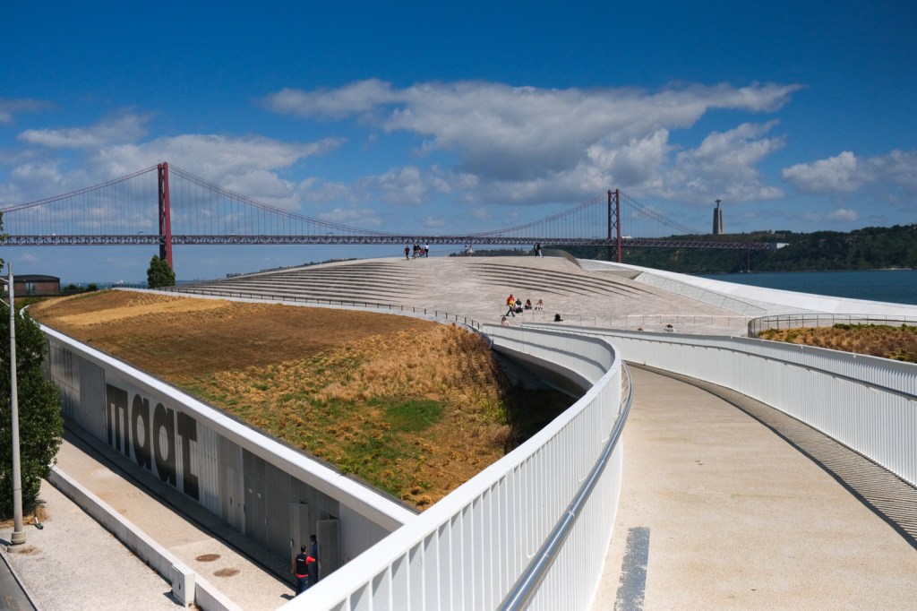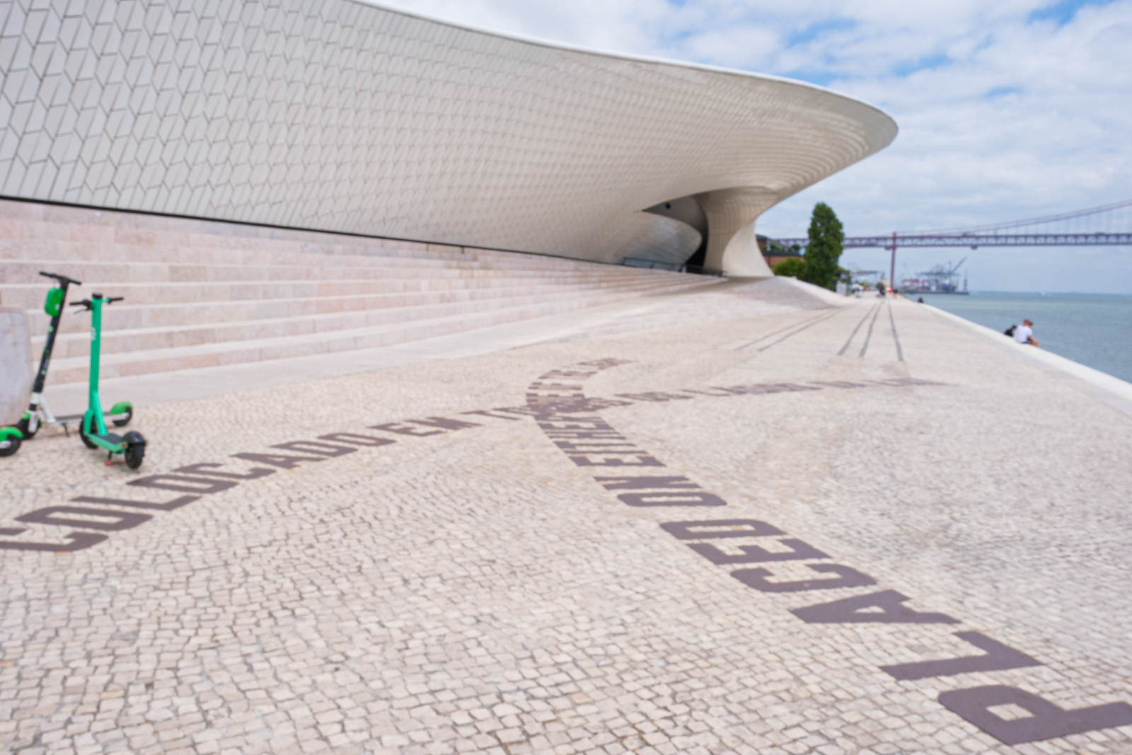 J’ai déjà eu l’occasion de dire ici, en 2016, le plaisir de regarder et de photographier l’édifice du MAAT (Museu de Arte, Arquitectura e Tecnologia), aux courbes élégantes, oeuvre de l’architecte britannique Amanda Levete. Situé sur les bords du Tage, à mi-chemin entre le Pont du 25 avril et le Padrão dos Descobrimentos, est une initiative de la Fundação EDP. EDP est la société énergétique portugaise. Pour rejoindre le MAAT, après avoir vu celle d’Ai Weiwei à la Cordoria Nacional, il suffit de traverser une passerelle au dessus de la voie rapide et de la ligne de chemin de fer qui joignent Lisbonne à Belém. Cela a quelque chose d’ironique : alors que Ai Weiwei dénonce l’asservissement progressif de l’Occident à la Chine communiste, l’EDP est contrôlée à 21,35 % par la China Three Gorge Corporation. En 2018, ce consortium chinois a même tenté une prise de contrôle hostile, repoussée par l’assemblée des actionnaire en 2019. Parmi les autres actionnaires importants, figurent la Qatar Investment Authority et BlackRock, la contestée société d’investissement new yorkaise. Ce caractère multinational du tour de table de la société portugaise rend un peu dérisoire le titre de l’exposition qui s’y tient actuellement. Google Translate me permet de traduire rapidement le communiqué de presse :